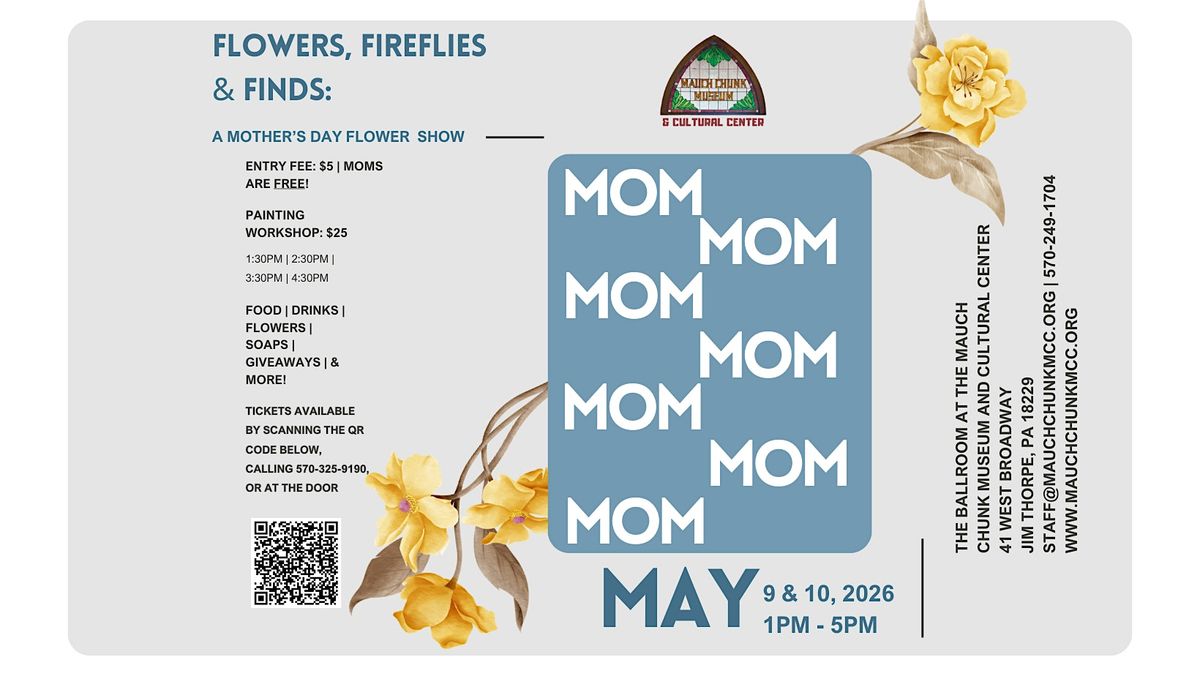 Then join us for the inaugural “Flowers, Fireflies & Finds: A Mother’s Day Flower Show” taking place in The Ballroom at the Mauch Chunk Museum & Cultural Center! The Flower Show will run on both Saturday, May 9 and Sunday, May 10, 2026 from 1pm to 5pm. The fee is $5 to enter and moms are FREE! (The first 25 moms in the doors on both days will receive a special gift!)