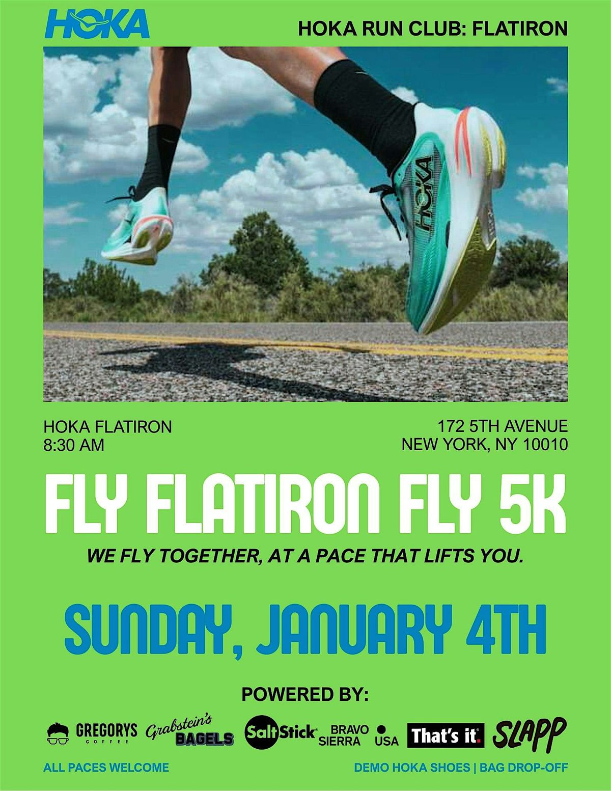 Welcome to FLY FLATIRON FLY: 5K—HOKA Run Club: Flatiron's rebranded Sunday morning community run series.