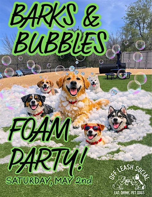 Foam Party at Off Leash SocialGet ready… we’re turning the park into a giant foam pit.Join us at Off Leash Social on Saturday, May 2 for a massive foam party featuring a high-powered foam cannon that will cover the entire space in bubbles.Dogs and humans alike can run, jump, and play in mountains of foam while enjoying drinks, food, and music in our outdoor venue. Whether you’re bringing your pup or just coming for the party, this is one of the most unique and fun events in Johnson City.