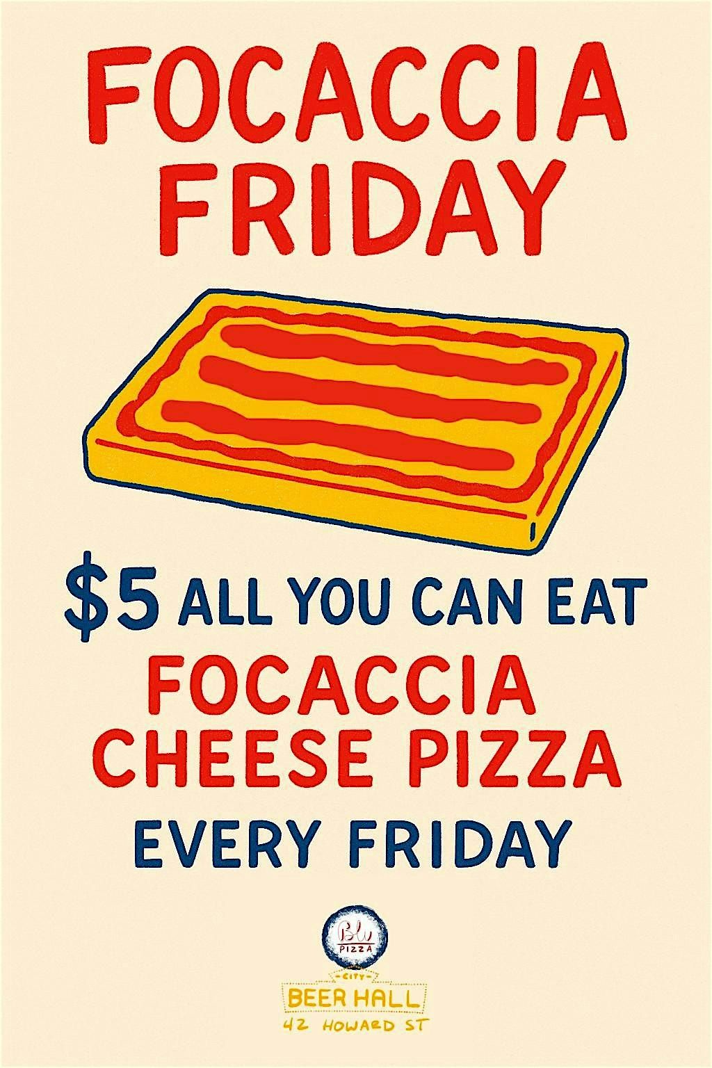 Dough, tomato and cheese. Fluffy, crispy, if you know you know- an outrageous offer. Grab a friend and feast. $5 all you can eat focaccia