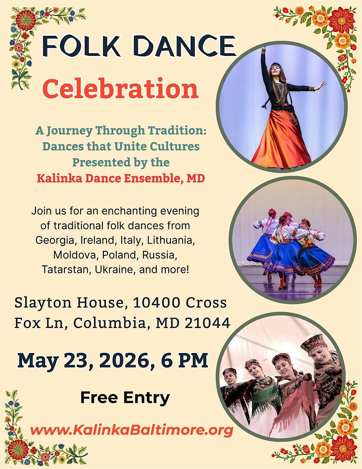 Join us for an enchanting evening of traditional folk dances from Georgia, Ireland, Italy, Lithuania, Moldova, Poland, Russia, Tatarstan, Ukraine, and more! Family-friendly event.