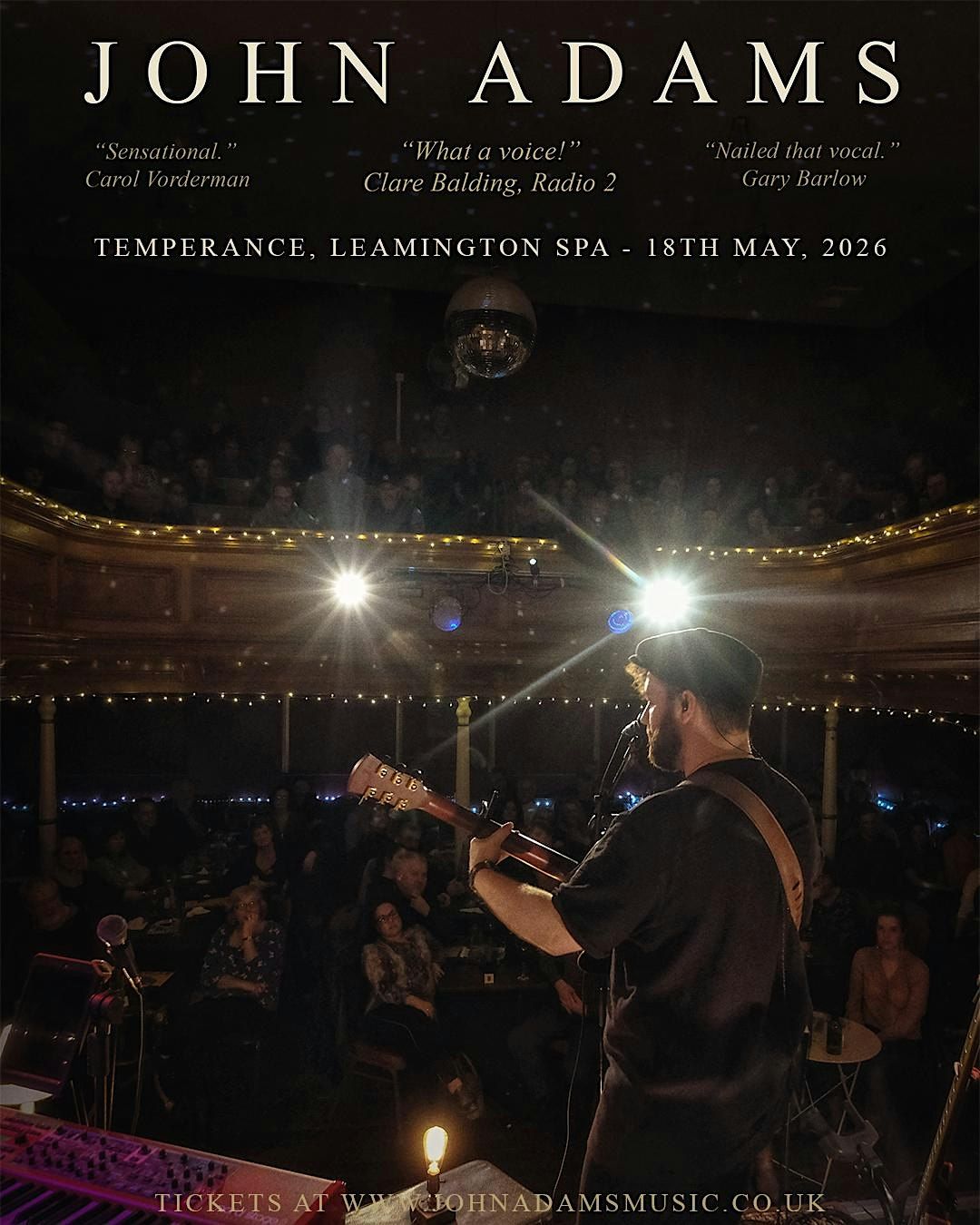 His live performances have earned praise from Clare Balding (BBC Radio 2), Gary Barlow, and Carol Vorderman, who described his shows as “Sensational.” With over a decade of live experience, sold-out UK tours, and support slots alongside major artists, John Adams delivers a live show that is both emotionally resonant and effortlessly engaging.