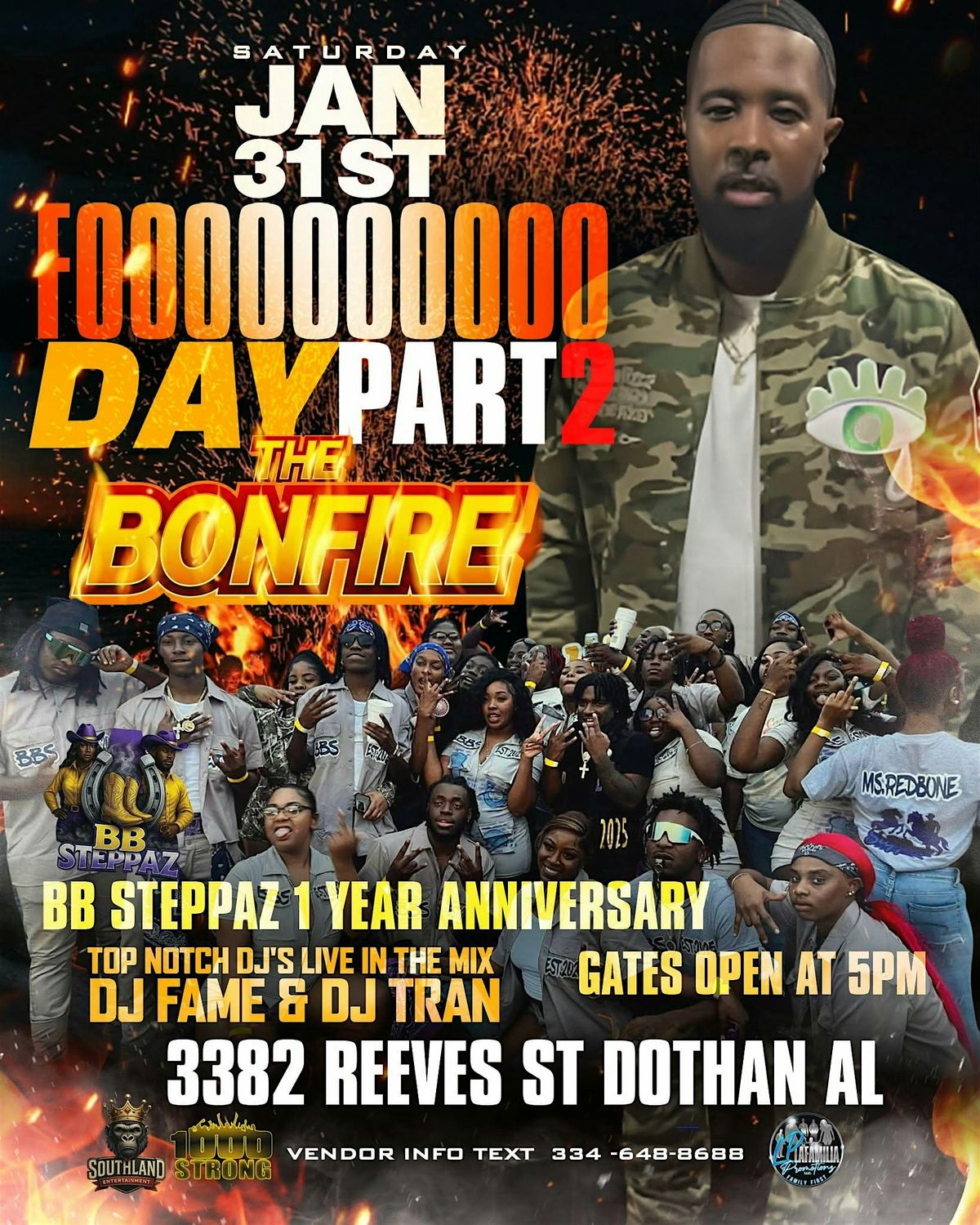 The biggest bonfire in Dothan is happening Jan 31st! Foo Day 3382 Reeves St Gates open @ 5PM Celebrating the BB Steppaz 1 yr Anniversary