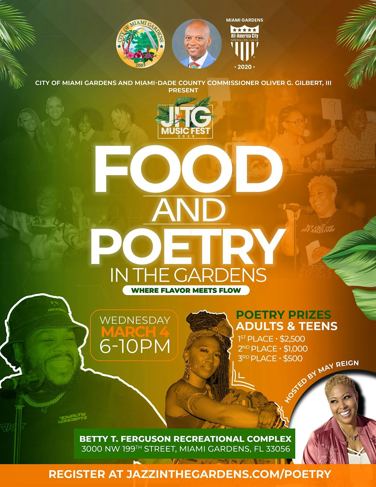 As part of the JITG Music Fest experience, Food & Poetry in the Gardens brings together the best of both worlds—mouthwatering bites from top food vendors and electrifying performances from Miami Gardens’ finest poets and spoken word artists.