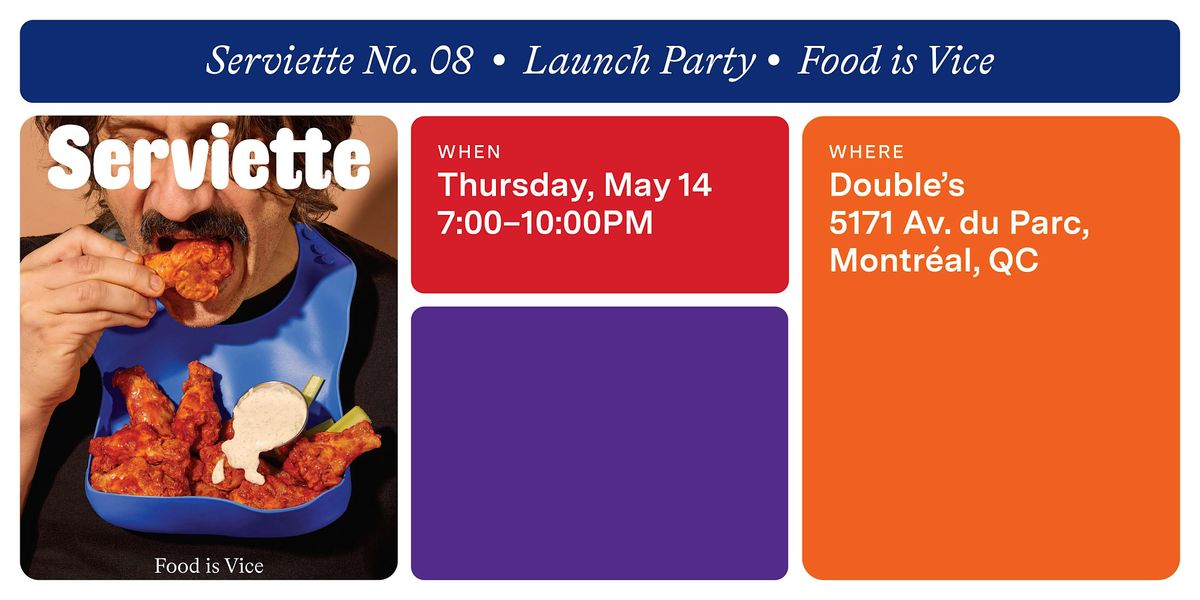 Venez célébrer le lancement de notre huitième numéro, Food is Vice, jeudi le 14 mai de 19h30 à 23h chez @doubleslatenight, situé au 5171 avenue du Parc. L’admission de 10$ vient avec une bière et un p’tit shooter au bar. Passez vous procurer une exemplaire de Serviette, essayez de manger des ailes de poulet piquantes pour gagner un prix et restez pour les surprises que nous vous préparons