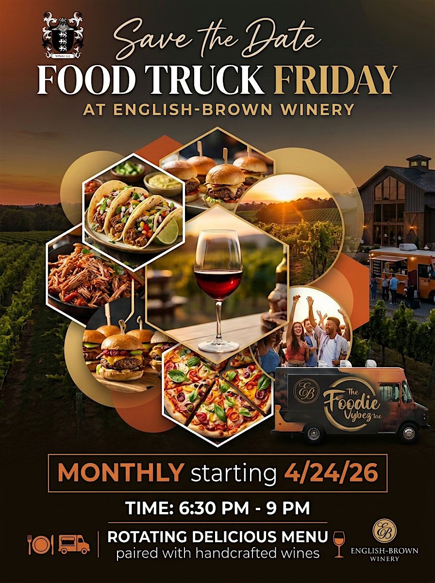 Join us at English-Brown Winery on Friday, April 24th from 6:30 PM – 9 PM for the return of one of your favorite nights—Food Truck Friday featuring The Foodie Vybez Food Truck.