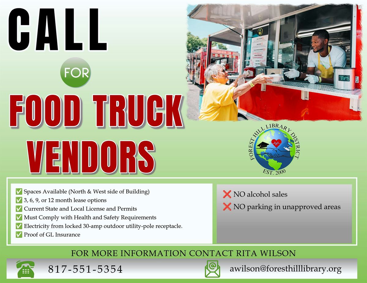 The Forest Hill Library District is opening a LIMITED number of food truck spots, and we want YOU to bring your delicious dishes to the heart of our community! 🍔🌮🍗