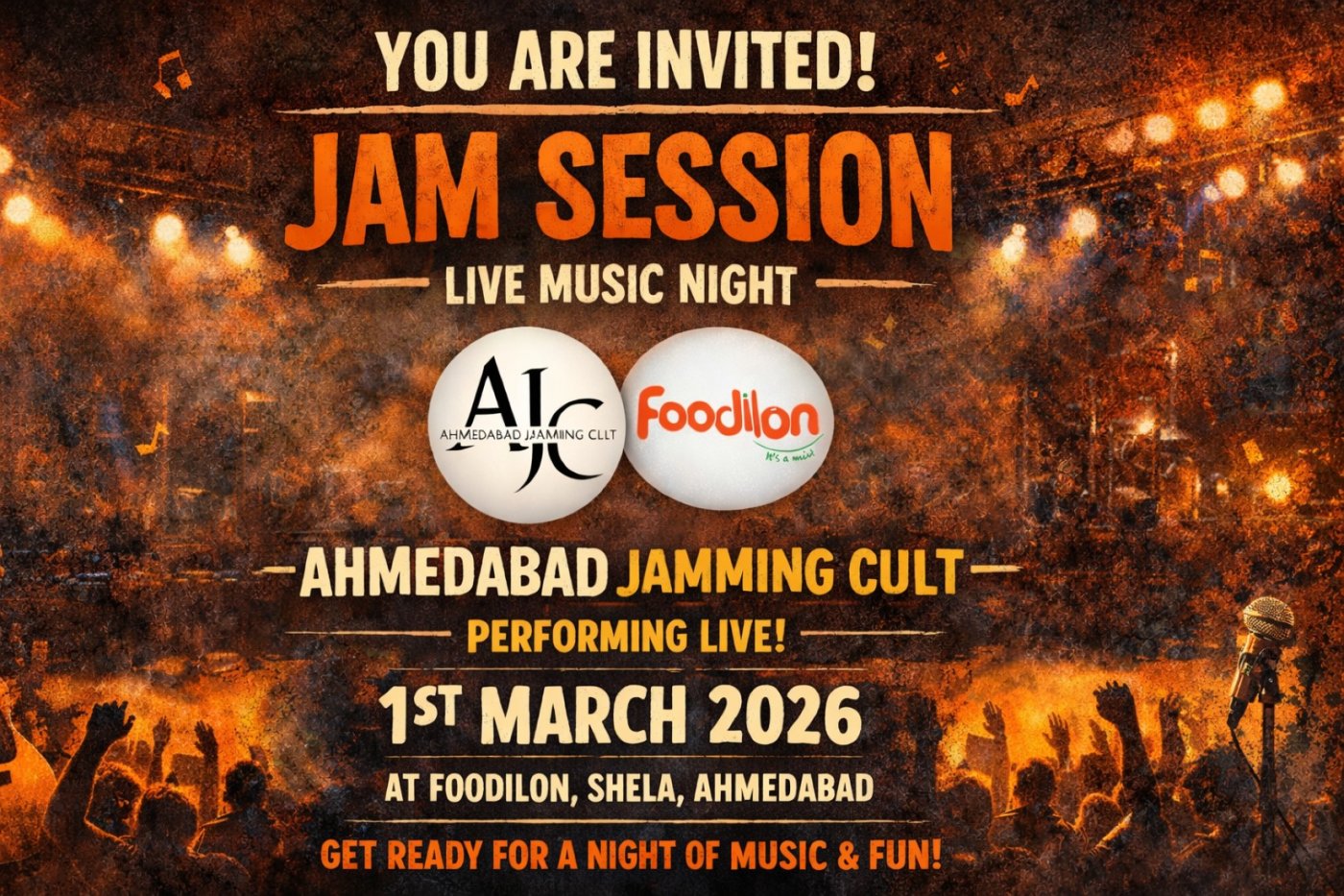 From the banks of the Riverfront to every corner of Ahmedabad, the AJC (Ahmedabad Jamming Cult) has redefined the city’s music scene. Now, we’re bringing that pioneer spirit to Foodilon Live Music Night. Join us as we celebrate the "Cult" that started it all. It’s more than a performance; it’s a community jam where the rhythm of the city meets a curated culinary experience.