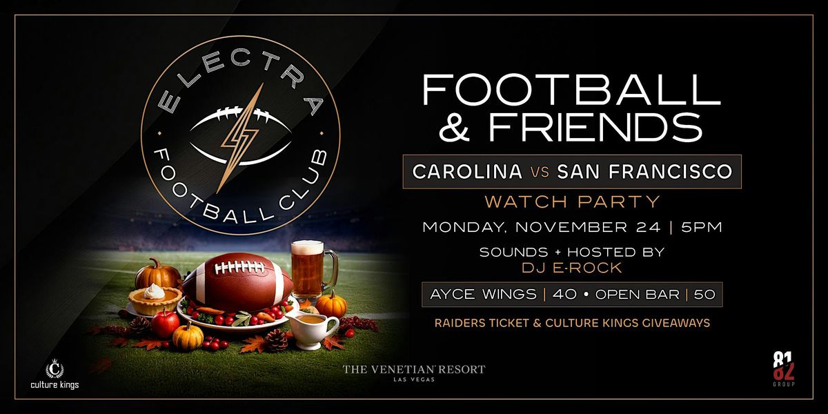 Join us at Electra for “Football & Friends,” a Friendsgiving-style Monday Night Football watch party featuring Carolina vs San Francisco, hosted by DJ E-Rock on November 24 at 5 PM.