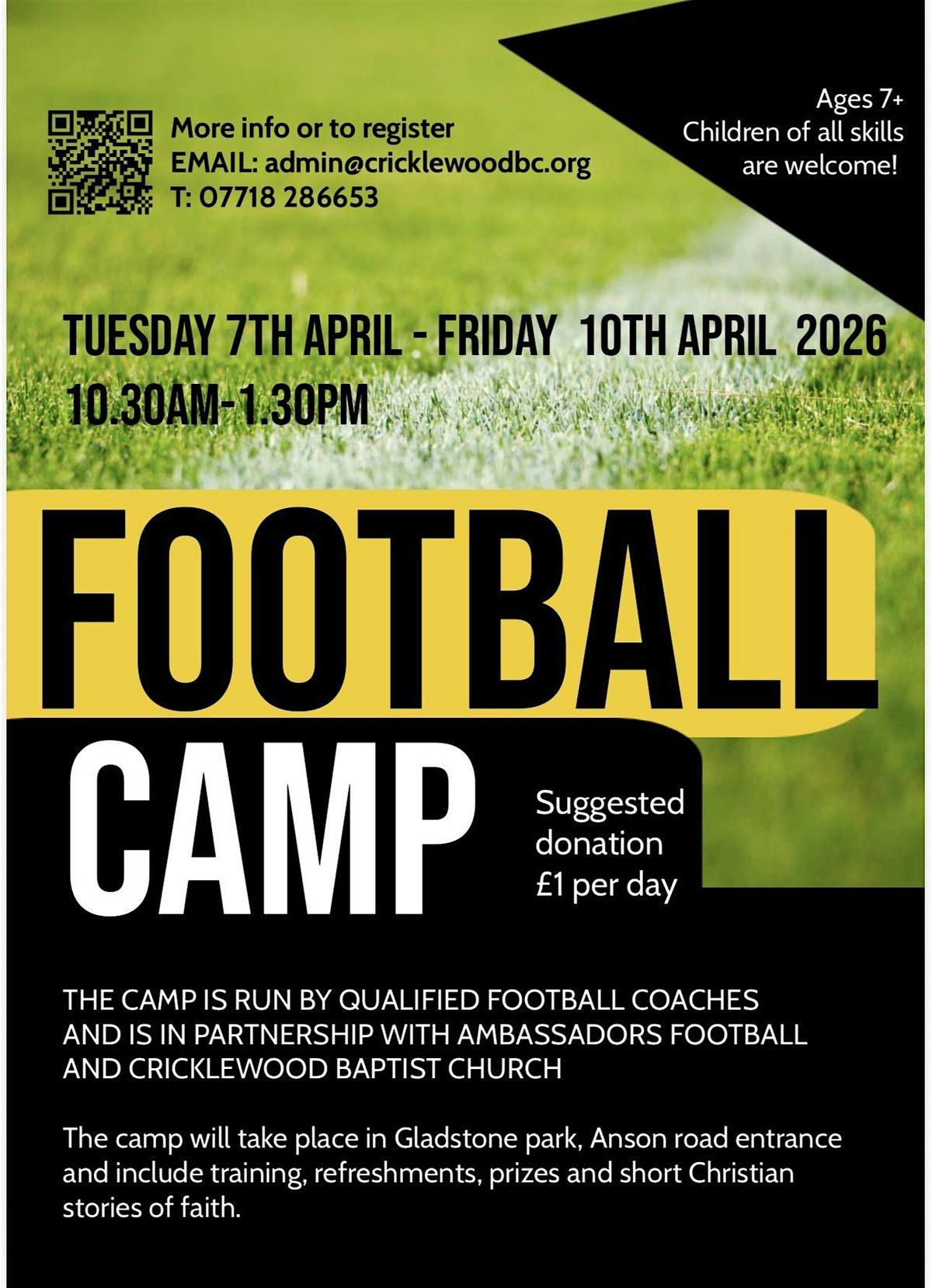 Football camp run by qualified coaches from Ambassadors Football and Cricklewood Baptist Church.