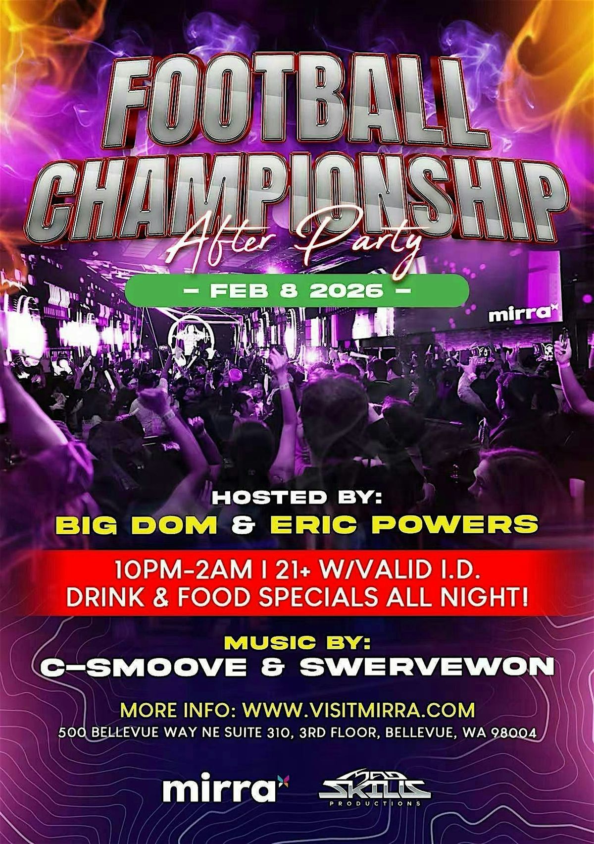 Join us for the Football Championship After Party at Mirra, kicking off immediately after the game and going late into the night until 2:00 AM. The venue fully transitions into nightlife mode for a high-energy celebration.