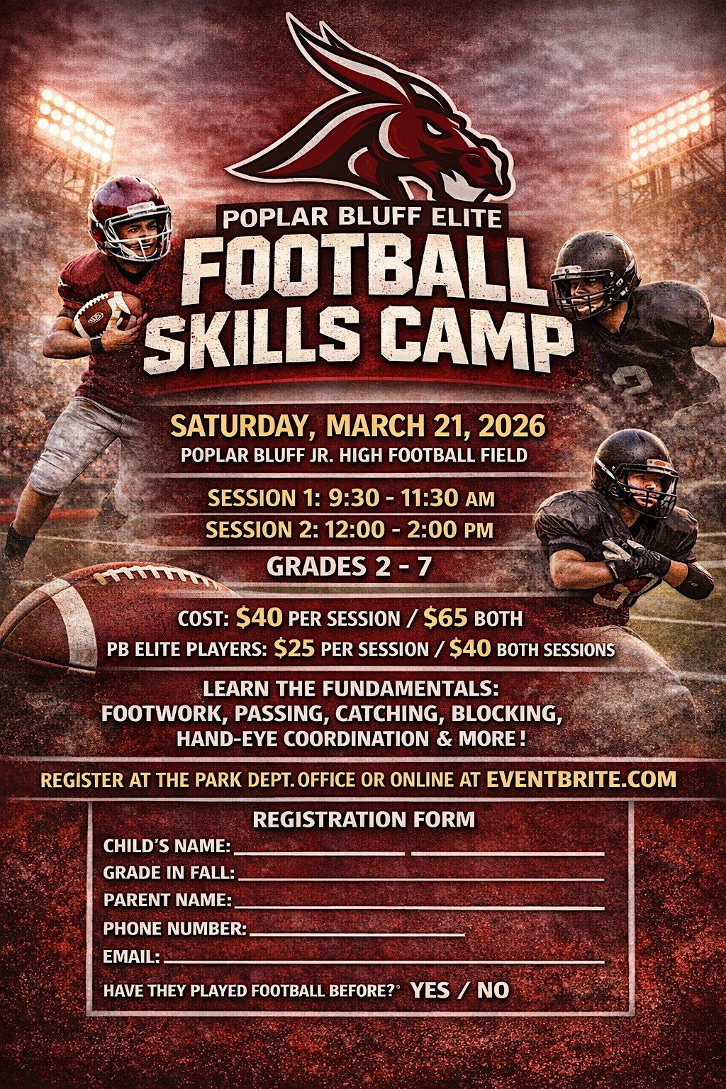 This monthly football camp is for youth in grades 2-7. We’ll focus on the fundamentals of football: footwork, passing, catching, blocking, hand-eye coordination and understanding the game. Two sessions are available: 9:30am-11:30pm and 12pm-2:00pm. You may also attend both camps for a reduced price. Contact Coach Allen Scott at 317-672-8899 for more information. All proceeds go to Poplar Bluff Elite Travel Football, a 501c3 non-profit organization.