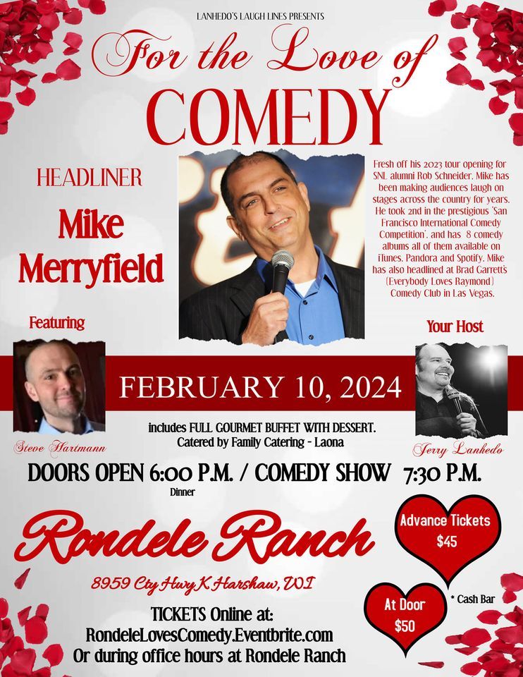 Get ready to laugh until your sides hurt at the For The Love of Comedy event! Join us at the beautiful Rondele Ranch in Harshaw, WI, USA for a night of non-stop laughter , great Gourmet food, and great vibes . This in-person event will feature a lineup of hilarious, professional comedians who will leave you in stitches. So grab your sweetheart ( or group of friends) and your sense of humor, and get ready for an unforgettable evening of laughter. Don't miss out on this comedy extravaganza!Buffet begins at 6:00 p.m.