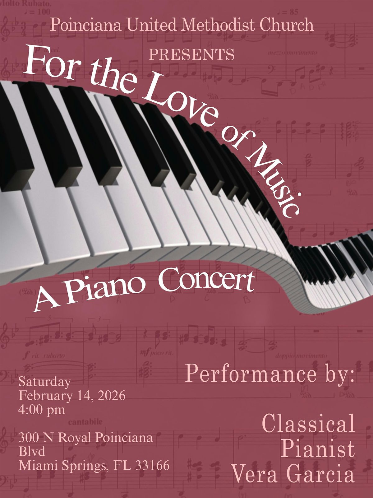 Join us for an exclusive performance by classical pianist Vera Garcia on February 14th at 4:00 PM. We’ve scheduled this special engagement specifically so you can enjoy a world-class concert and still have plenty of time for your evening dinner plans. Admission is free, though love offerings will be gratefully accepted to support the artist. Whether you are coming with a partner or simply a love for the arts, it promises to be a beautiful prelude to your holiday celebrations.