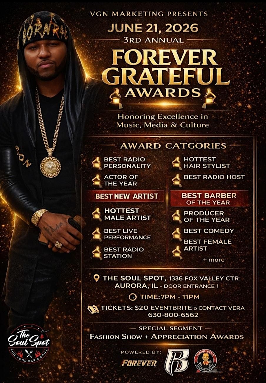 Get ready to celebrate in person at the FOREVER GRATEFUL AWARD SHOW! This is the perfect opportunity to honor amazing talents and unforgettable moments. Come join the fun, enjoy great vibes, and be part of an unforgettable night filled with laughter, inspiration, and heartfelt thanks. Don't miss out on this epic event where gratitude takes center stage!