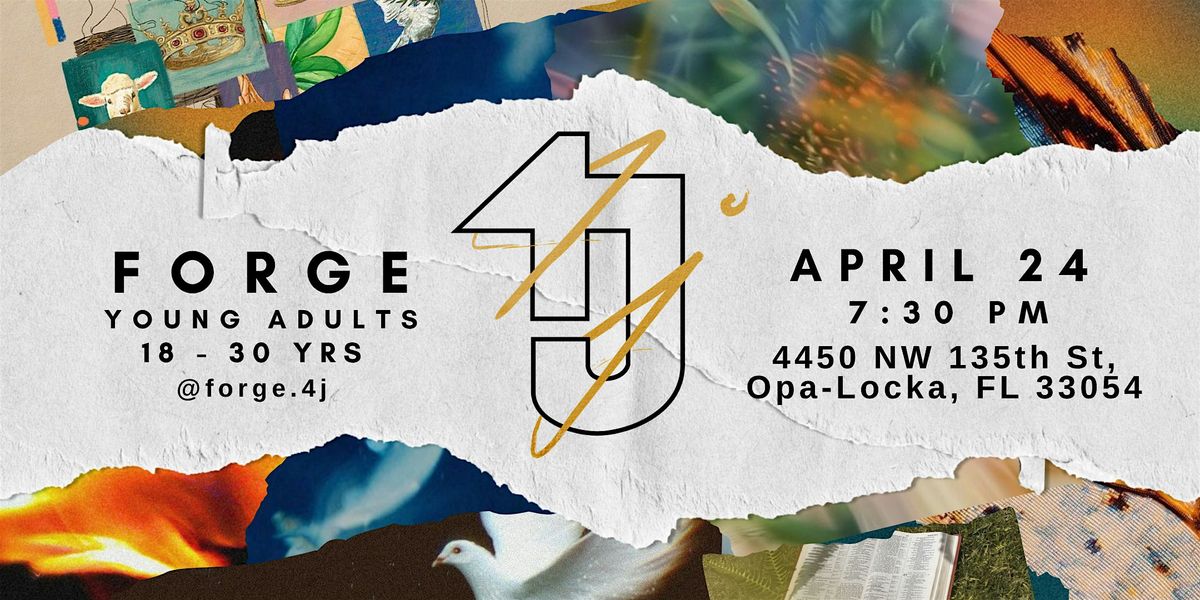 Forge⁴ʲ is a monthly popup event for young adults in South Florida. Join us Friday, April 24th from 7:30pm to 9:30pm. Whether you’ve been walking with Jesus for years or you’re still figuring it all out — you belong in the room!