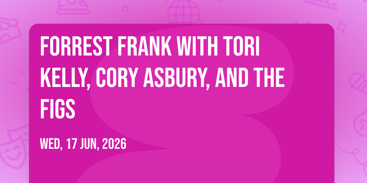 📍 Location: 35.2248, -80.8403🌟 Journey into wonder at Forrest Frank with Tori Kelly, Cory Asbury, and The Figs, where extraordinary experiences await around every corner! 🏛️ Set against the backdrop of Spectrum Center - Charlotte in dynamic Charlotte, NC, this event promises to exceed all expectations. 📅 Join us on June 17th, 2026 at 11:00 PM for a celebration that combines innovation, entertainment, and community spirit in perfect harmony. ✨ There will be an atmosphere where memories are made and stories come alive, ensuring every guest experiences something truly remarkable. 🎊 This is more than just an event; it's a journey into the extraordinary!