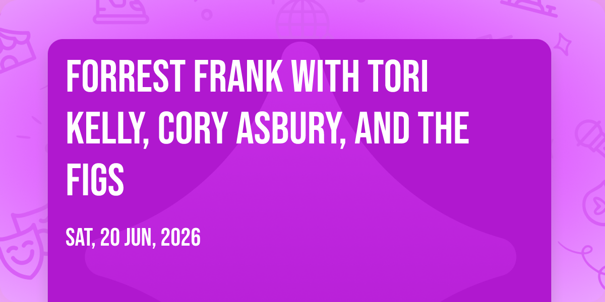 📍 Location: 39.764, -86.1556🎉 Welcome to Forrest Frank with Tori Kelly, Cory Asbury, and The Figs, where dreams come alive and possibilities are endless! 🏛️ Join us at Gainbridge Fieldhouse in the heart of Indianapolis, IN for an event that defies expectations. 📅 On June 20th, 2026 at 11:00 PM, be part of something truly extraordinary as we bring together innovation, entertainment, and pure magic. ✨ Every aspect has been carefully designed to ensure an unforgettable experience for all our guests. Whether you're seeking adventure, inspiration, or simply a break from the ordinary, this event promises to deliver beyond your wildest dreams. 🎊 Prepare for a journey into the extraordinary!