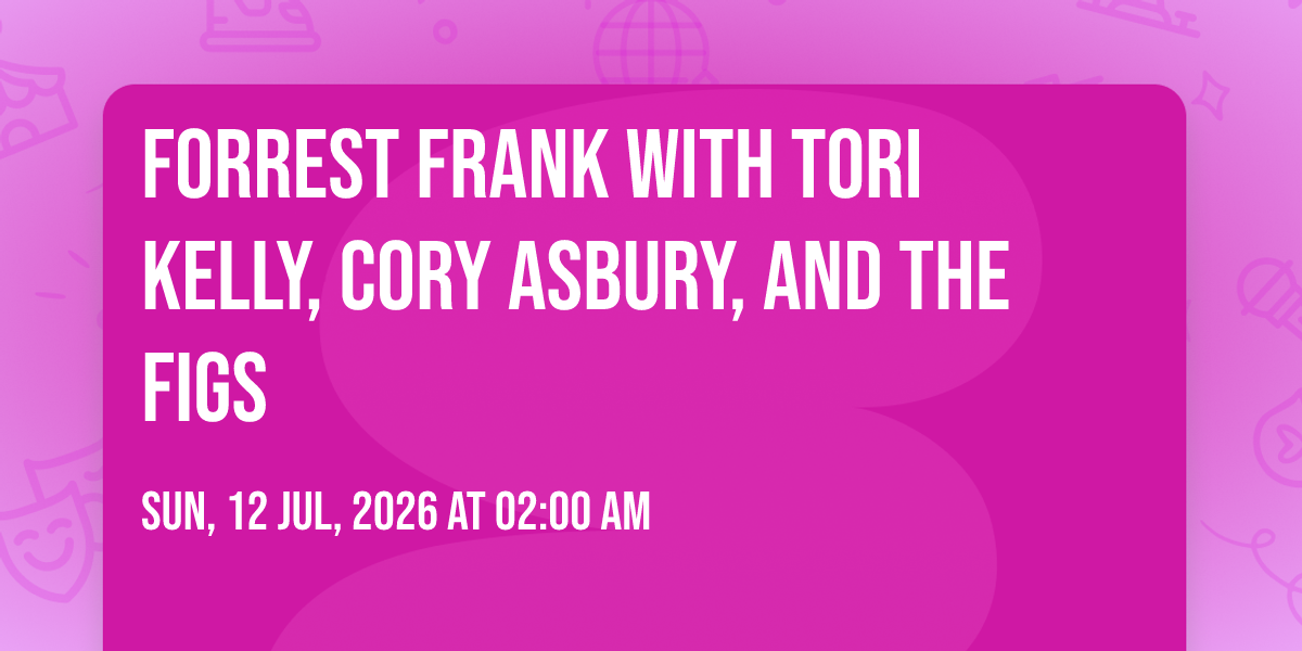 π Location: 45.5316, -122.667π Welcome to Forrest Frank with Tori Kelly, Cory Asbury, and The Figs, where dreams come alive and possibilities are endless! ποΈ Join us at Moda Center in the heart of Portland, OR for an event that defies expectations. π On July 12th, 2026 at 02:00 AM, be part of something truly extraordinary as we bring together innovation, entertainment, and pure magic. β¨ Every aspect has been carefully designed to ensure an unforgettable experience for all our guests. Whether you're seeking adventure, inspiration, or simply a break from the ordinary, this event promises to deliver beyond your wildest dreams. π Prepare for a journey into the extraordinary!