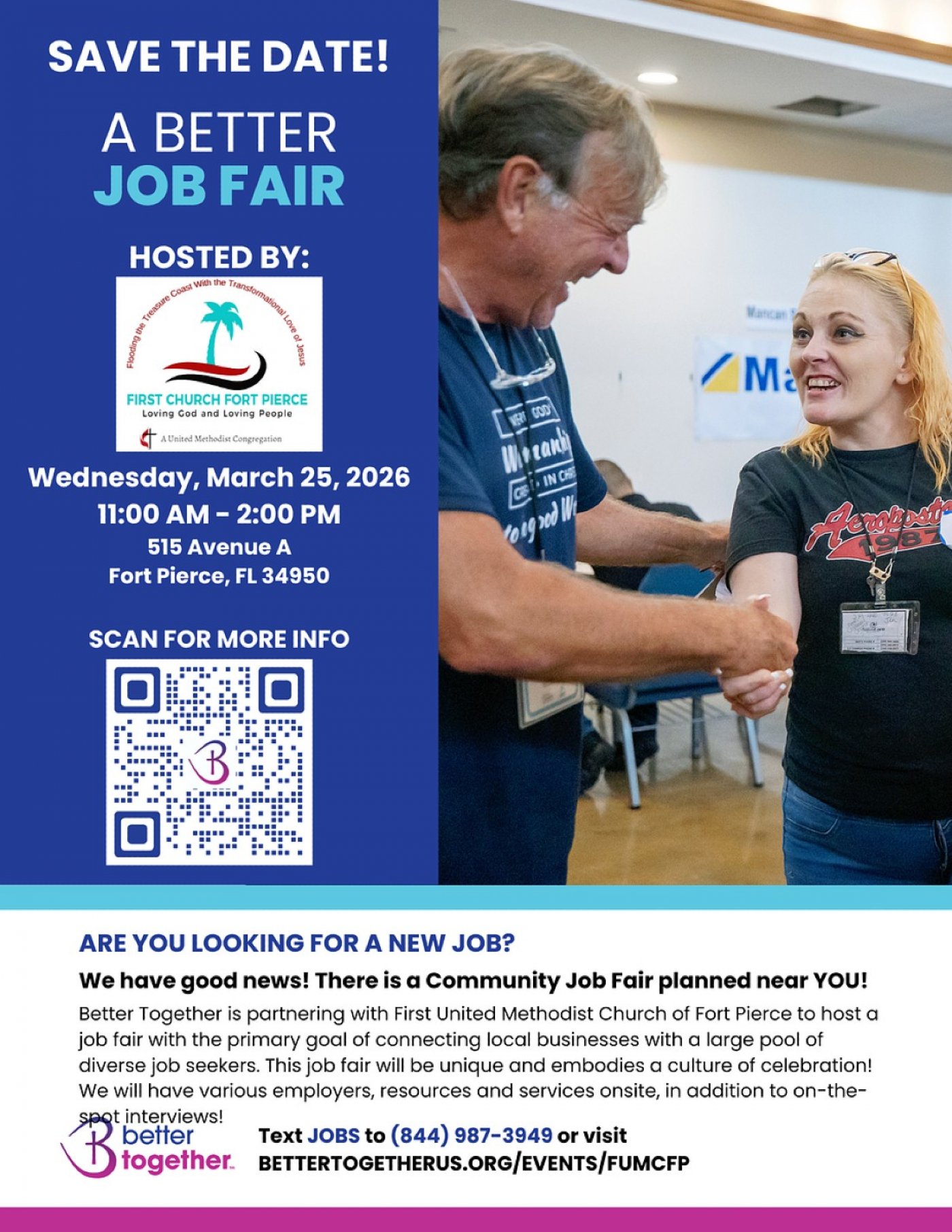 Join us for the Better Together Job Fair hosted by First Church Fort Pierce (UMC) and connect with local employers and community resource partners — all in one place!