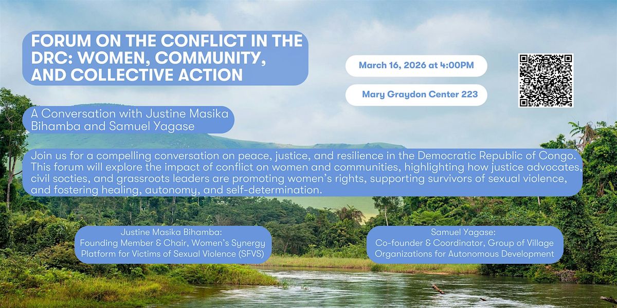 Join us for a compelling conversation on peace, justice, and resilience in the Democratic Republic of Congo. This forum will explore the impact of conflict on women and communities, highlighting how justice advocates, civil socties, and grassroots leaders are promoting women’s rights, supporting survivors of sexual violence, and fostering healing, autonomy, and self-determination.
