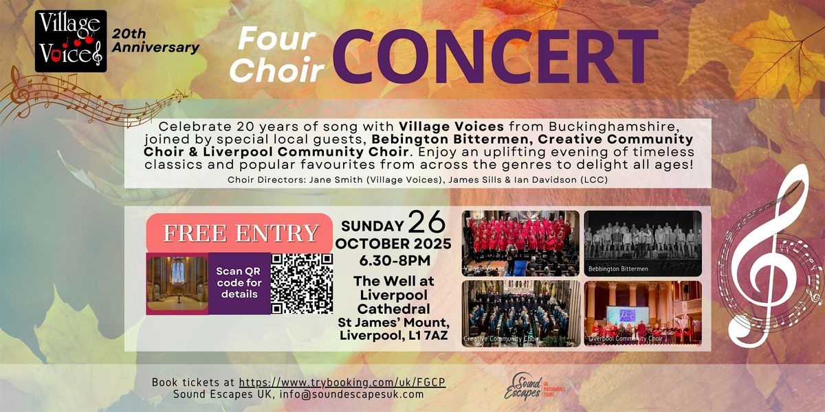 Celebrate 20 years of song with Village Voices from Buckinghamshire, joined by special local guests, Bebington Bittermen, Creative Community Choir & Liverpool Community Choir. Enjoy an uplifting evening of timeless classics and popular favourites from across the genres to delight all ages!