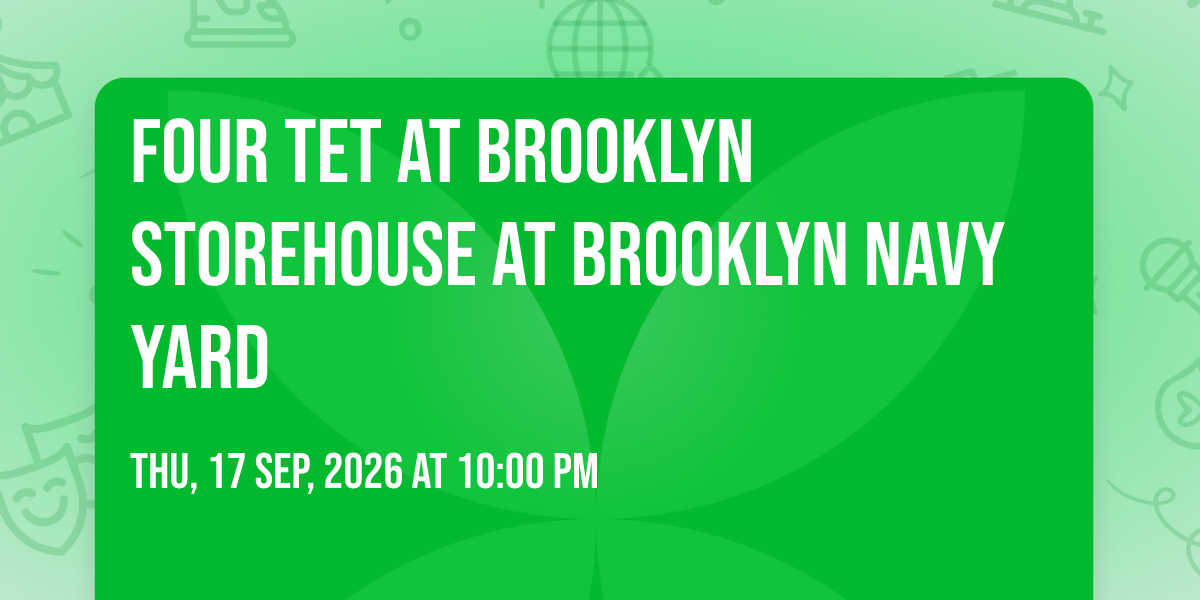 ๐ Be part of history at Four Tet at Brooklyn Storehouse at Brooklyn Navy Yard, an extraordinary gathering that will captivate your imagination! ๐๏ธ The prestigious Brooklyn Storehouse at Brooklyn Navy Yard in Brooklyn, NY sets the stage for an unforgettable experience on September 17th, 2026 at 10:00 PM. โจ They are bringing together the finest elements of entertainment and innovation to create moments that will take your breath away. From the moment you arrive, you'll be immersed in an atmosphere of wonder and excitement. ๐ฏ This carefully planned event ensures every guest experiences something truly special. ๐ Early booking is recommended for this must-attend event of the season!
