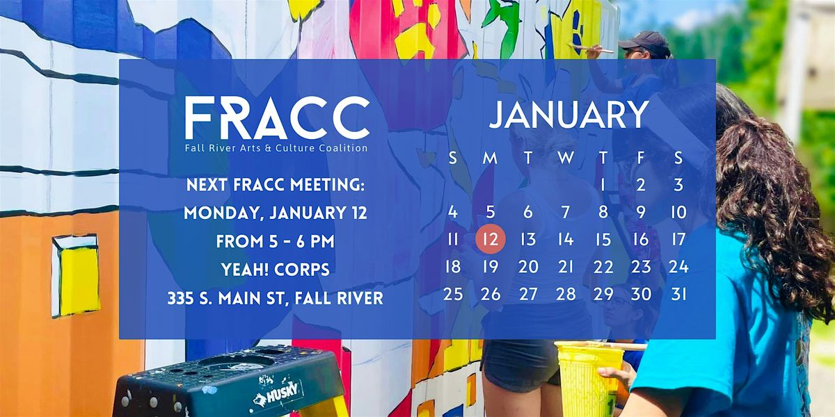 Next FRACC meeting is Monday, January 12 at 5PM. Join us for networking and updates from the Fall River Arts & Culture Coalition!