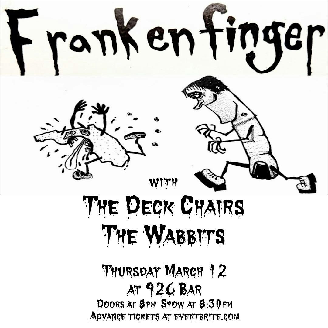 Local legends FRANKENFINGER, fresh off their sold-out show for Pioneers of Punk, will be doing another night in Tallahassee, at 926 Bar, along with their alter-ego, THE DECK CHAIRS, reunited local indie faves THE WABBITS and a band tba!