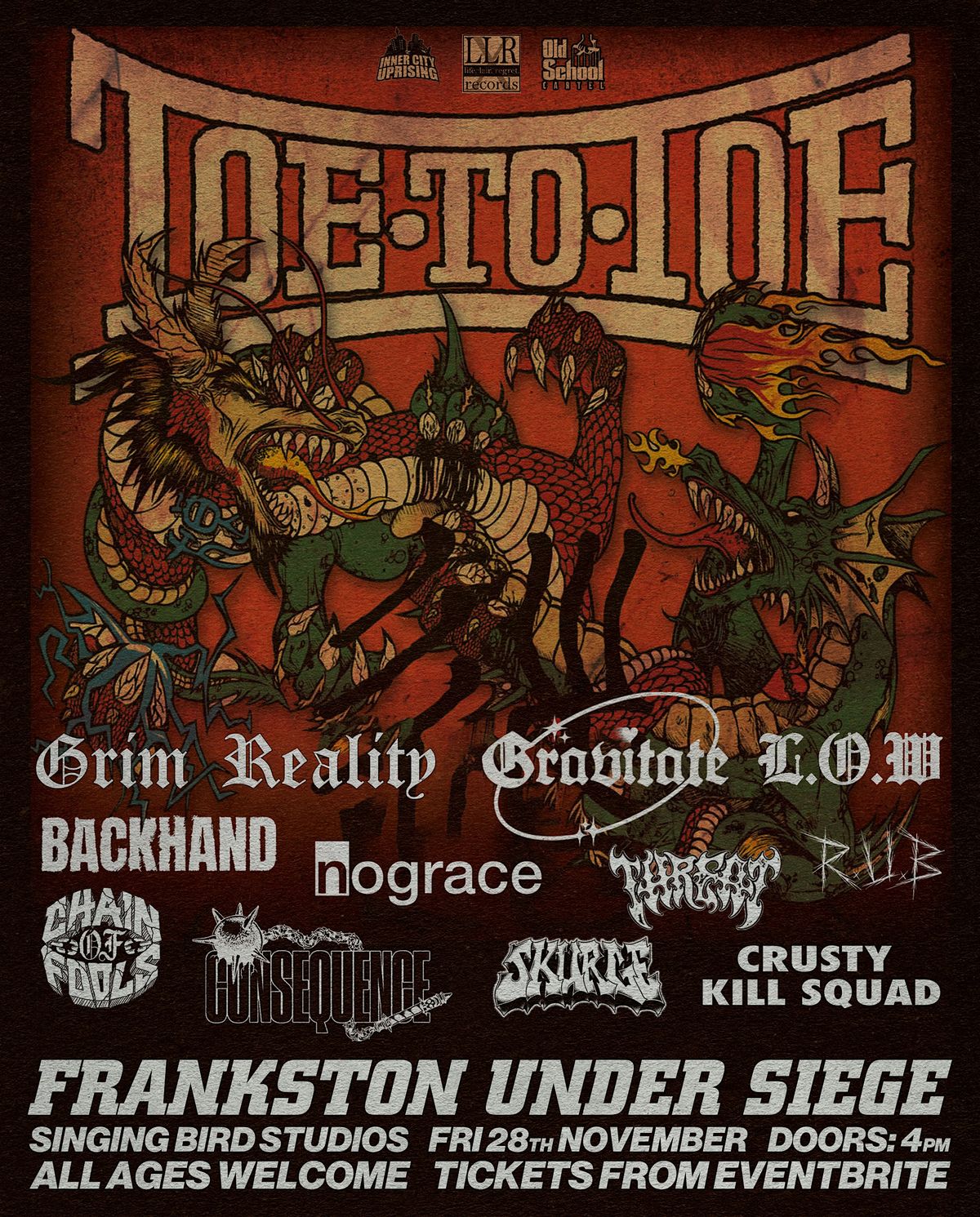 After sold out shows in both their home town and Queensland, legendary, old school Sydney hardcore act TOE TO TOE are headed south for the first time in 8 years to headline a stacked ALL AGES show at Frankston’s SINGING BIRD STUDIOS this coming November.