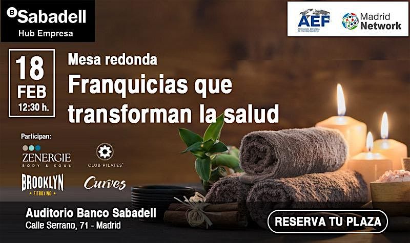 Desde Madrid Network nos complace invitarte al Ciclo de Conferencias que organiza Sabadell Franquicias con motivo de su 30 Aniversario. La temática del evento será: Franquicias que transforman la salud, con la colaboración de la Asociación Española de la Franquicia (AEF), que se celebrará el día 18 de febrero a las 12:30h, Auditorio Banco Sabadell, calle Serrano, 71, 28006 Madrid.