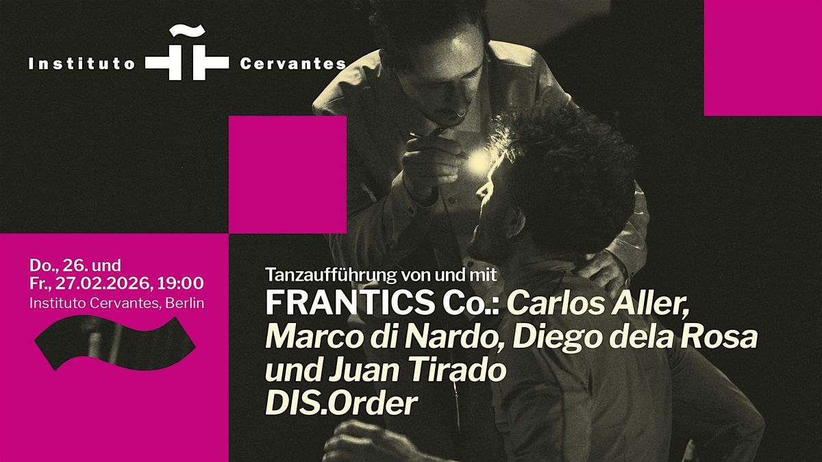 Frantics ist eine Tanzkompanie aus Berlin, die 2013 von Carlos Aller, Marco di Nardo, Diego de la Rosa und Juan Tirado gegründet wurde. Das Ensemble mit italienischen und spanischen Wurzeln kombiniert Urban Dance mit zeitgenössischem Tanz, Physical Theatre und Texttheater, literarische und philosophische Einflüsse und schafft so Stücke fürs Theater und andere Räume. Sie haben es sich zur Aufgabe gemacht, ganz unterschiedliche Menschen mit ihrer Kunst zu erreichen und zu inspirieren. Ihre Stücke waren bereits auf internationaler Bühne zu sehen und wurden mit zahlreichen Preisen ausgezeichnet. Neben ihrem gemeinsamen Schaffen arbeiten die vier jeweils auch mit anderen namhaften Künstler*innen und Kompanien aus den Bereichen Tanz, Musik und bildende Kunst zusammen.