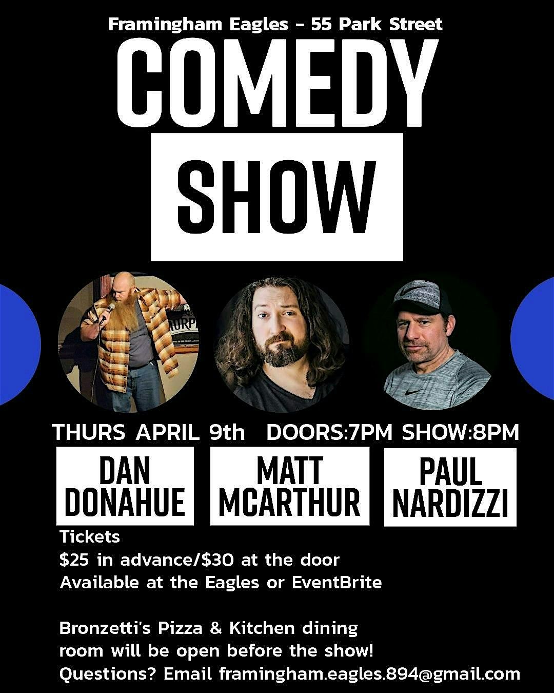 Welcome to the Fraternal Order of Eagles Framingham 894 Comedy Show! Get ready to laugh your socks off at our hilarious event featuring Scamps Comedy top comedians: Dan Donahue, Matt McArthur, and Framingham's own Paul Nardizzi. Join us on Thursday, April 9, 2026 at 55 Park St. Doors open at 7:00 PM and the show starts at 8:00 PM. It's going to be a night full of fun, laughter, and good times. Don't miss out on this amazing opportunity to enjoy some quality comedy with friends and family.
