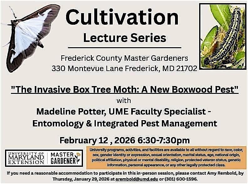 Join the Frederick County Master Gardeners for the Cultivation Lecture Series and learn about The Invasive Box Tree Moth: A New Boxwood Pest.
