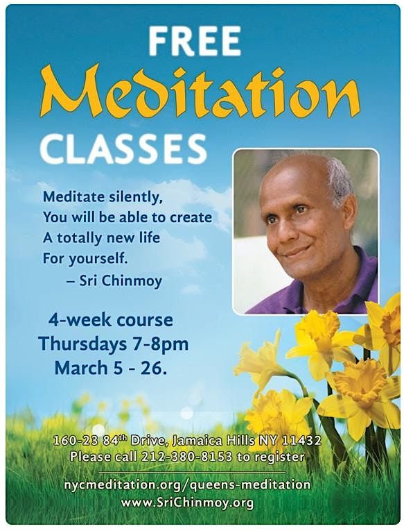 Join us for a Free 4-Week Meditation Workshop in Jamaica Hills, Queens! This in-person event will be held at 160-23 84th Drive (1st floor). Whether you're new to meditation or a seasoned practitioner, this workshop is open to all levels. The course is based on the teachings of spiritual teacher Sri Chinmoy. Reserve your spot today!