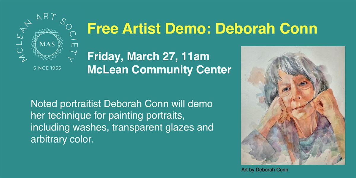 In this free public demo, Deborah will demonstrate her technique for painting portraits, starting with a multicolored wash. She will add shadows to define the shape of the face and further define features, using applications of transparent glazes and arbitrary color.