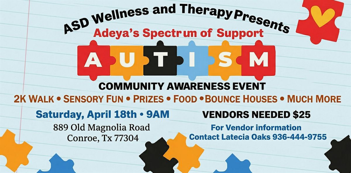 Success On The Spectrum Magnolia Center, will be participating in ASD Wellness and Therapy's Autism Awareness Free Community Event by hosting a vendor booth and sharing information about our services with the community.