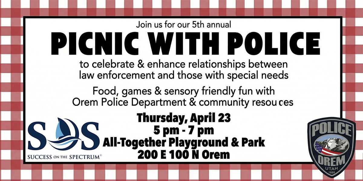 Come join our community at Picnic with Police to celebrate and enhance relationships between law enforcement and those with special needs Thursday, April 23rd from 5pm to 7pm at the All-Together Playground & Park!