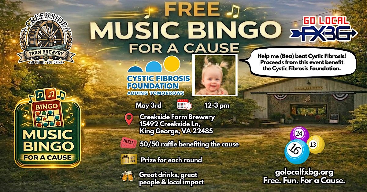 Join us for a fun afternoon of music, bingo, prizes, and community impact at Creekside Farm Brewery!