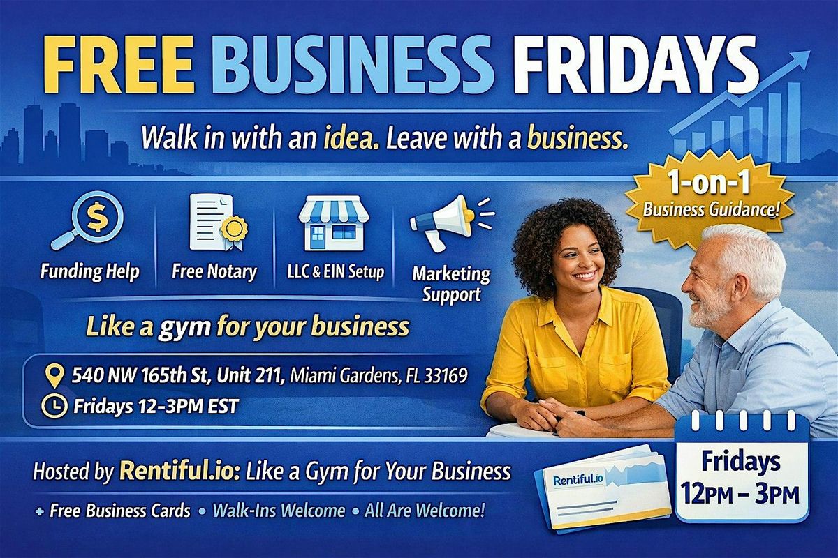 Free Business Fridays is a walk in business clinic to help you start or grow your business with real guidance the same day. Get support with funding, LLC setup, EIN, marketing, merchant services, and free notary.