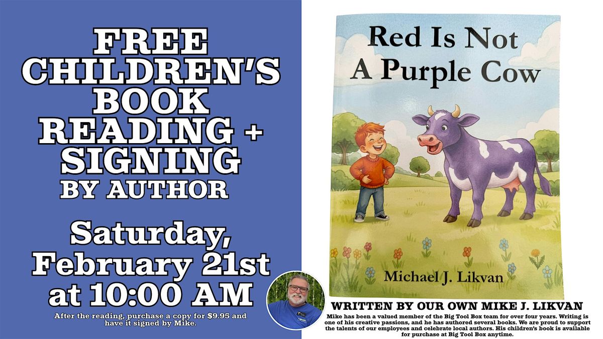 Join us Saturday, February 21st at 10:00 AM for a free children’s storytime with Big Tool Box’s own Mike J. Likvan. Mike has been a valued member of our team for over four years, and writing is one of his creative passions. He will read his children’s book, “Red Is Not a Purple Cow”, which tells the story of Red, a young boy who moves from the big city and starts first grade at a school where he knows no one. Excited to learn, Red faces challenges with dyslexia and teasing from classmates, until he meets Violet the cow. With her guidance, Red learns new ways to handle tough situations and sees the brighter side of life.