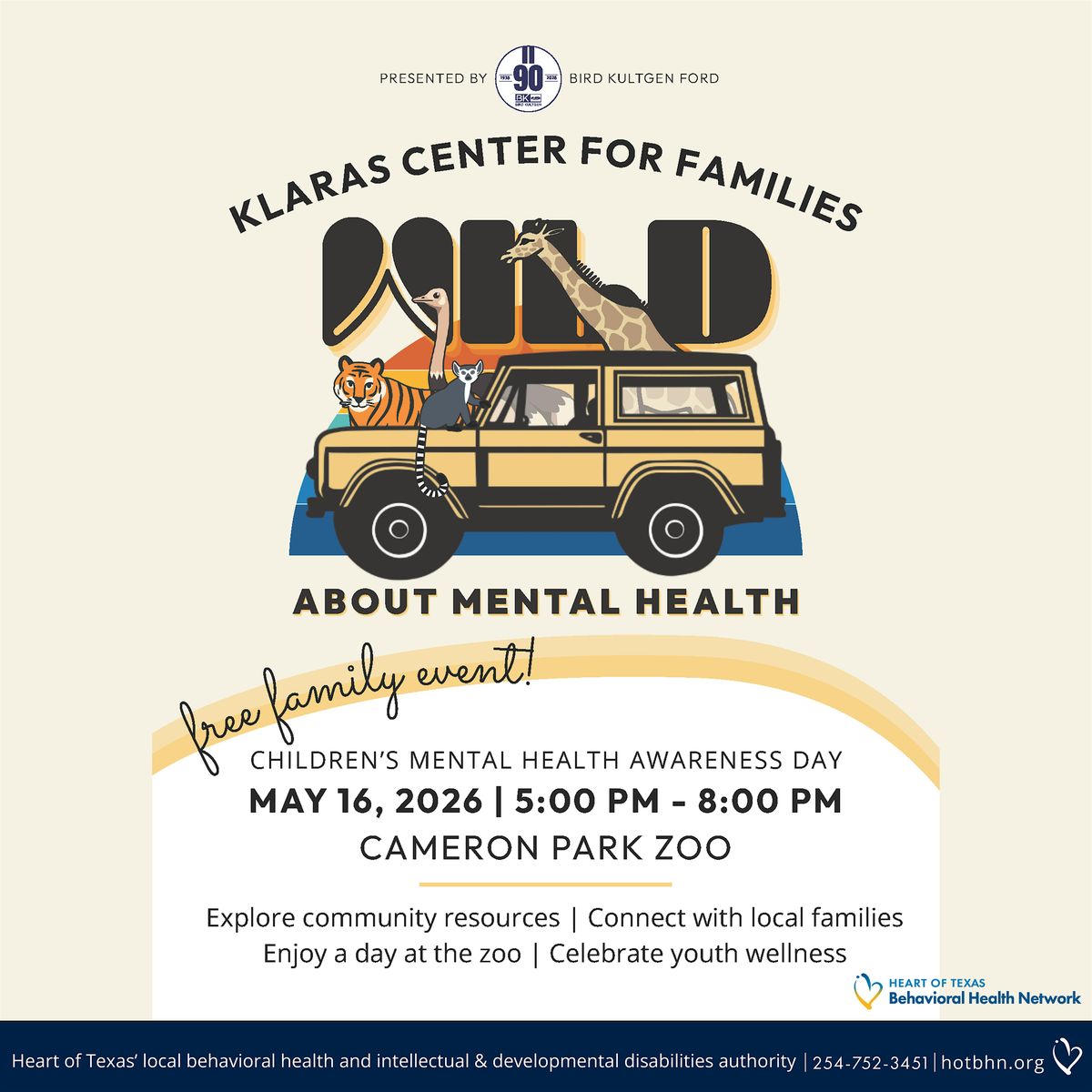 Come join the fun at Cameron Park Zoo as the HOTBHN’s Klaras Center for Families hosts a vibrant celebration for Children’s Mental Health Awareness Day, proudly presented by Bird Kultgen Ford! There will be drinks, snacks, community resources, and more!Date: Saturday,