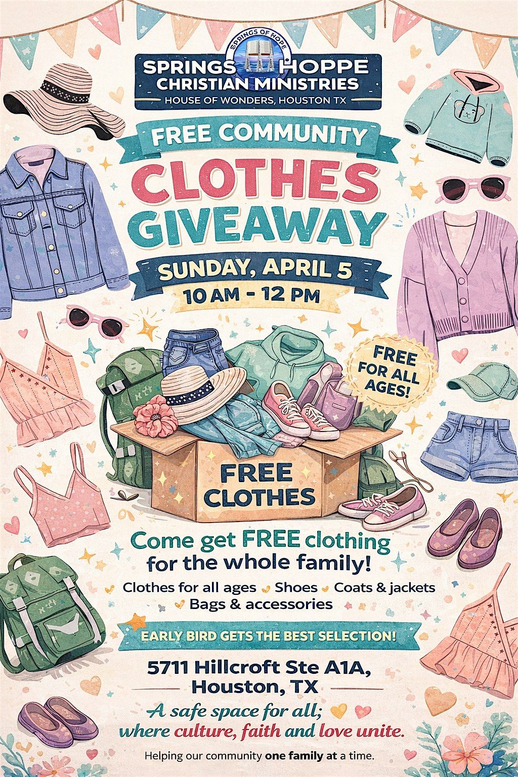 Hey there! Swing by our Free Clothes Giveaway and snag some awesome outfits for yourself, (gently used). This is an in-person event, so come on down, browse, and pick out whatever catches your eye. Perfect chance to refresh your wardrobe without spending a dime. Bring friends, have fun, and leave with some cool clothes! This Easter Sunday, it's about community. We are here to pray together, worship together and lift up our Lord and savior Jesus Christ.