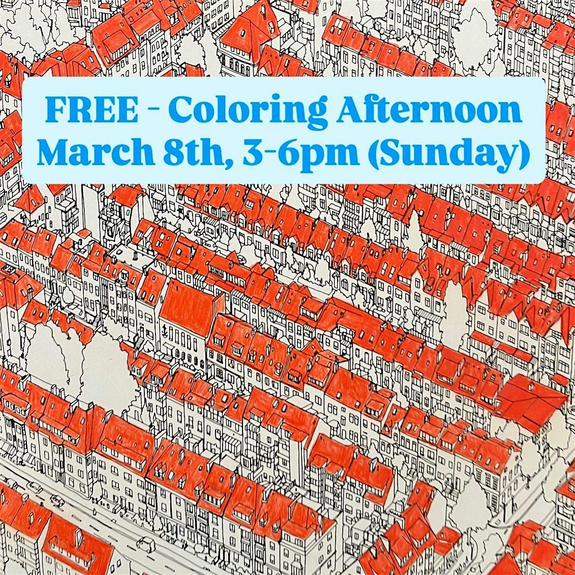 Free-to-attend community coloring time. We have plenty of coloring books, markers, pencils, and crayons for you to color to help you relax. Meet your neighbors and make some new friends, too!