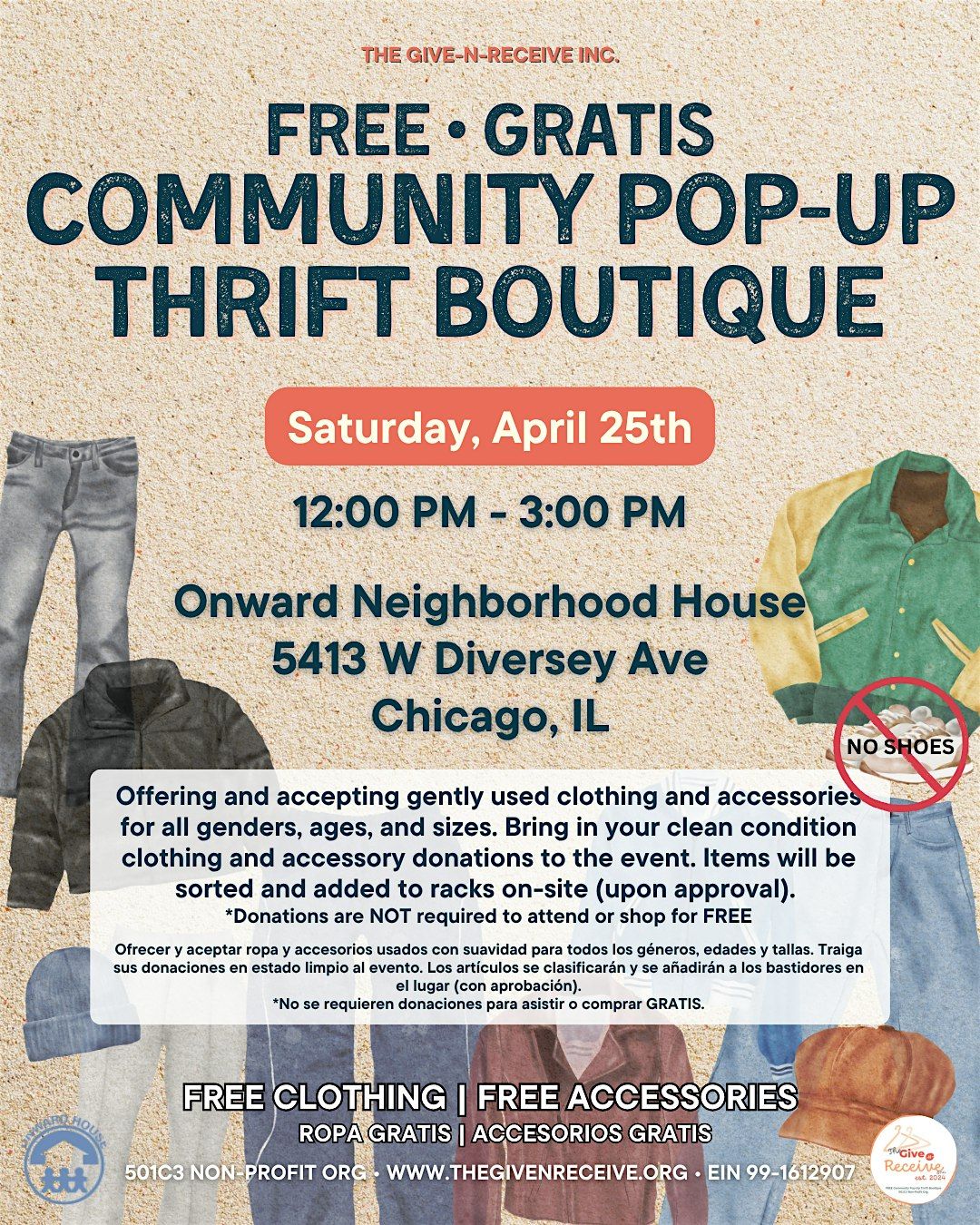 𖣳FREE Community Pop-up Thrift Boutique We are a FREE Community Pop-up Thrift Boutique that offers and accepts gently used clothing and accessories for ALL genders, ages, and sizes. Simply bring in your clean clothing and/or accessory donations to any pop-up boutique or clothing drive event. We will sort items on-site and either add them directly to the clothing racks or retain them for future boutiques. Remember, you do NOT have to donate in order to shop. And yes, everything is FREE!