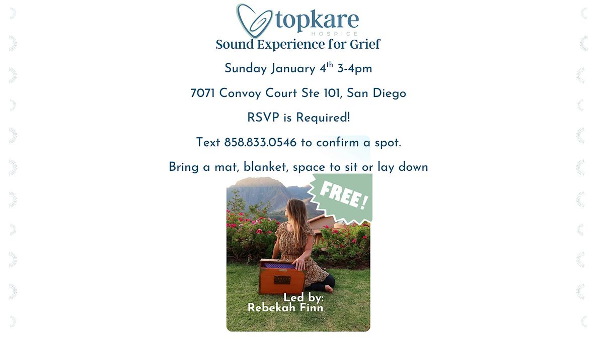 Join us for a Free Community Sound Experience for Grief at 7071 Convoy Ct suite 101. Topkare Hospice’s Bereavement & Volunteer Coordinator Rebekah Finn hosts Free Monthly Sound Experiences for Grief at our office the first Sunday of each month from 3pm-4pm. She plays instruments she’s collected throughout her global travels and honors wherever you are on your grief journey. Participants can be who they are and experience for themselves how the vibrations make them feel. We acknowledge grief is an individualized and human experience. Instruments may include: harmonium, shruti box, buffalo drum, bells, shaker, chapaka, therapeutic infinity harp, ocean drum, swing chime, crystal sound bowls, and wooden koshi chimes. Rebekah accompanies the musical instrument(s) by her angelic voice to help promote a safe, sacred space for relaxation, restoration and rejuvenation of your mind, body, spirit and soul. Please bring a mat, blanket, pillow, eye pillow, wear comfortable clothing and arrive 10 minutes early to get your space set up to help us start on time. DOORS ARE LOCKED AT 3:05PM. There are options to sit on the floor, or a chair, and you ca also lay down. This is a free open community event to anyone who may need support to be with their grief. RSVP is required to confirm a spot. After signing up on a event brite you will receive an email with instructions of location and YOU MUST Text Rebekah at 858.833.0546 or via email [email protected] to CONFIRM A SPOT. We look forward to meeting you and welcome you to our safe, sacred space.