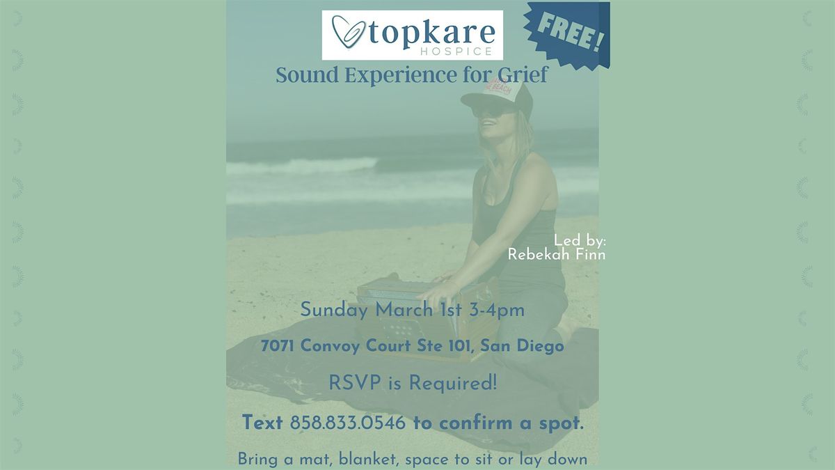 Join us for a Free Community Sound Experience for Grief at 7071 Convoy Ct suite 101. Topkare Hospice’s Bereavement & Volunteer Coordinator Rebekah Finn hosts Free Monthly Sound Experiences for Grief at our office the first Sunday of each month from 3pm-4pm. She plays instruments she’s collected throughout her global travels and honors wherever you are on your grief journey. Participants can be who they are and experience for themselves how the vibrations make them feel. We acknowledge grief is an individualized and human experience. Instruments may include: harmonium, shruti box, buffalo drum, bells, shaker, chapaka, therapeutic infinity harp, ocean drum, swing chime, crystal sound bowls, and wooden koshi chimes. Rebekah accompanies the musical instrument(s) by her angelic voice to help promote a safe, sacred space for relaxation, restoration and rejuvenation of your mind, body, spirit and soul. Please bring a mat, blanket, pillow, eye pillow, wear comfortable clothing and arrive 10 minutes early to get your space set up to help us start on time. DOORS ARE LOCKED AT 3:05PM. There are options to sit on the floor, or a chair, and you ca also lay down. This is a free open community event to anyone who may need support to be with their grief. RSVP is required to confirm a spot. After signing up on a event brite you will receive an email with instructions of location and YOU MUST Text Rebekah at 858.833.0546 or via email [email protected] to CONFIRM A SPOT. We look forward to meeting you and welcome you to our safe, sacred space.