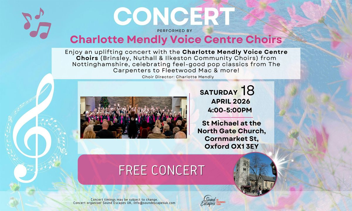 Enjoy an uplifting performance with the Charlotte Mendly Voice Centre Choirs (Brinsley, Nuthall & Ilkeston Community Choirs) from Nottinghamshire, celebrating feel-good pop classics from The Carpenters to Fleetwood Mac & more! Free entry with retiring collection to local charity (tbc).