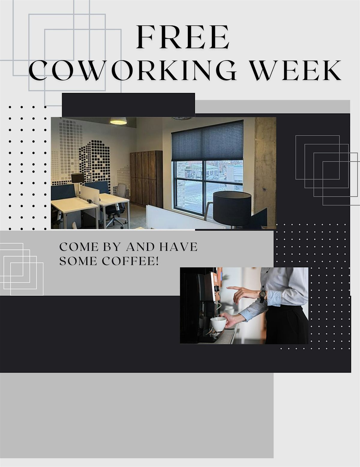 Enjoy a Free Coworking Week! Try our workspace, use an open desk, and enjoy free coffee while you work. Drop in anytime for great vibes!