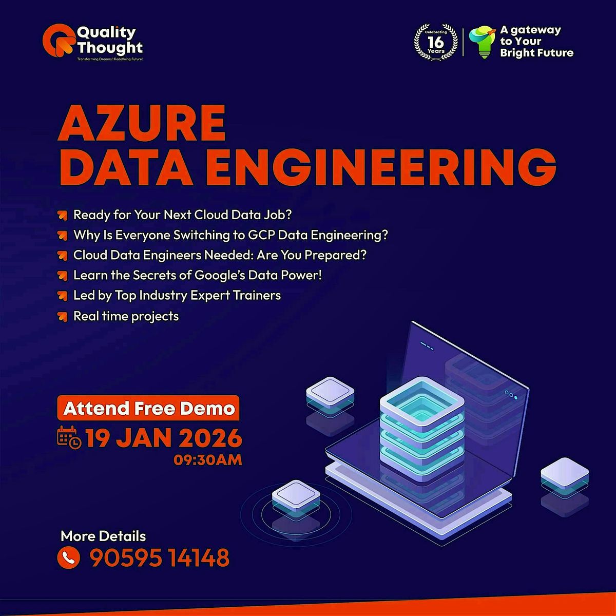 Info: Quality Thought, a reputed Software Training Institute, is organizing a Free Demo Session on Azure Data Engineer Training on 19 January 2026, starting from 09:30 AM onwards. This exclusive demo will be conducted in both Online and Offline modes, making it accessible to learners from across locations.